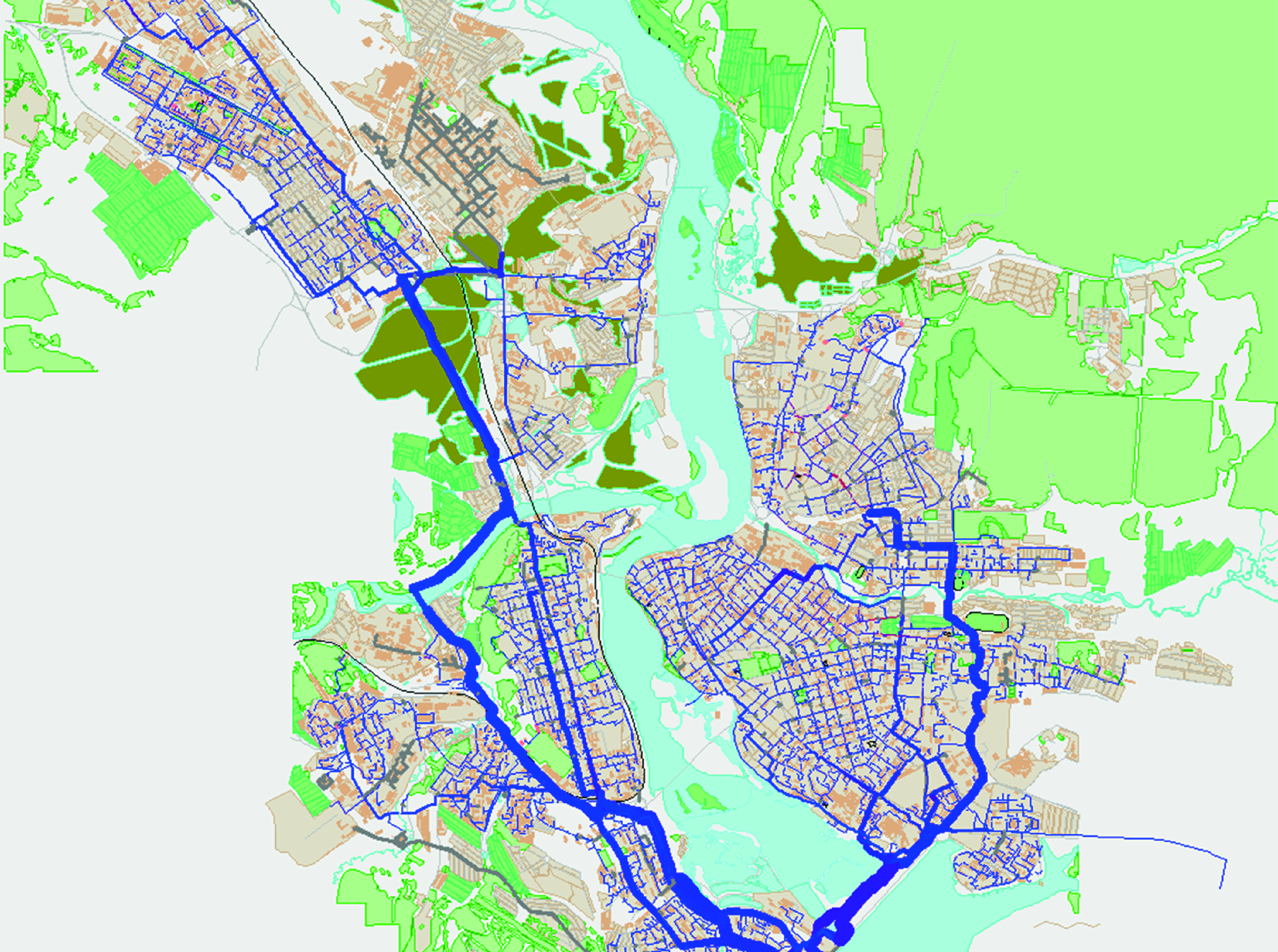 Как уже упоминалось ранее, одной из причин разработки представленного выше алгоритма являлся тот факт, что реальные СВС часто имеют КЗК. Вследствие этого оценка возраста и качества воды для таких систем вызывает затруднения. На рисунке 5 приведена реальная расчетная схема водоснабжения города, содержащая несколько КЗЦ и порядка 45 000 узлов сети. Расчет возраста воды во всех узлах данной схемы занимает менее 1 сек. Таким образом, можно констатировать, что использование предложенного алгоритма расчета возраста воды даже для сетей большой размерности не представляет вычислительных трудностей и может быть применено на практике эксплуатации СВС.