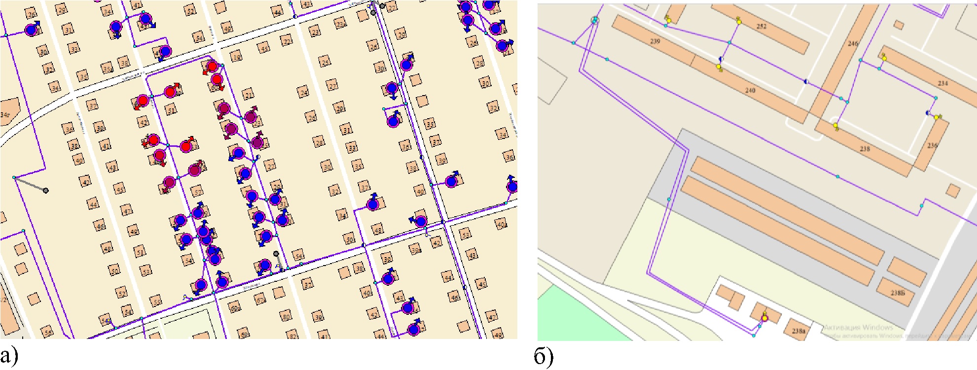 Рис. 6. Типичные схемы размещения потребителей с нарушением качества воды: а) в конце длинных улиц; б) при двухтрубной схеме подключения