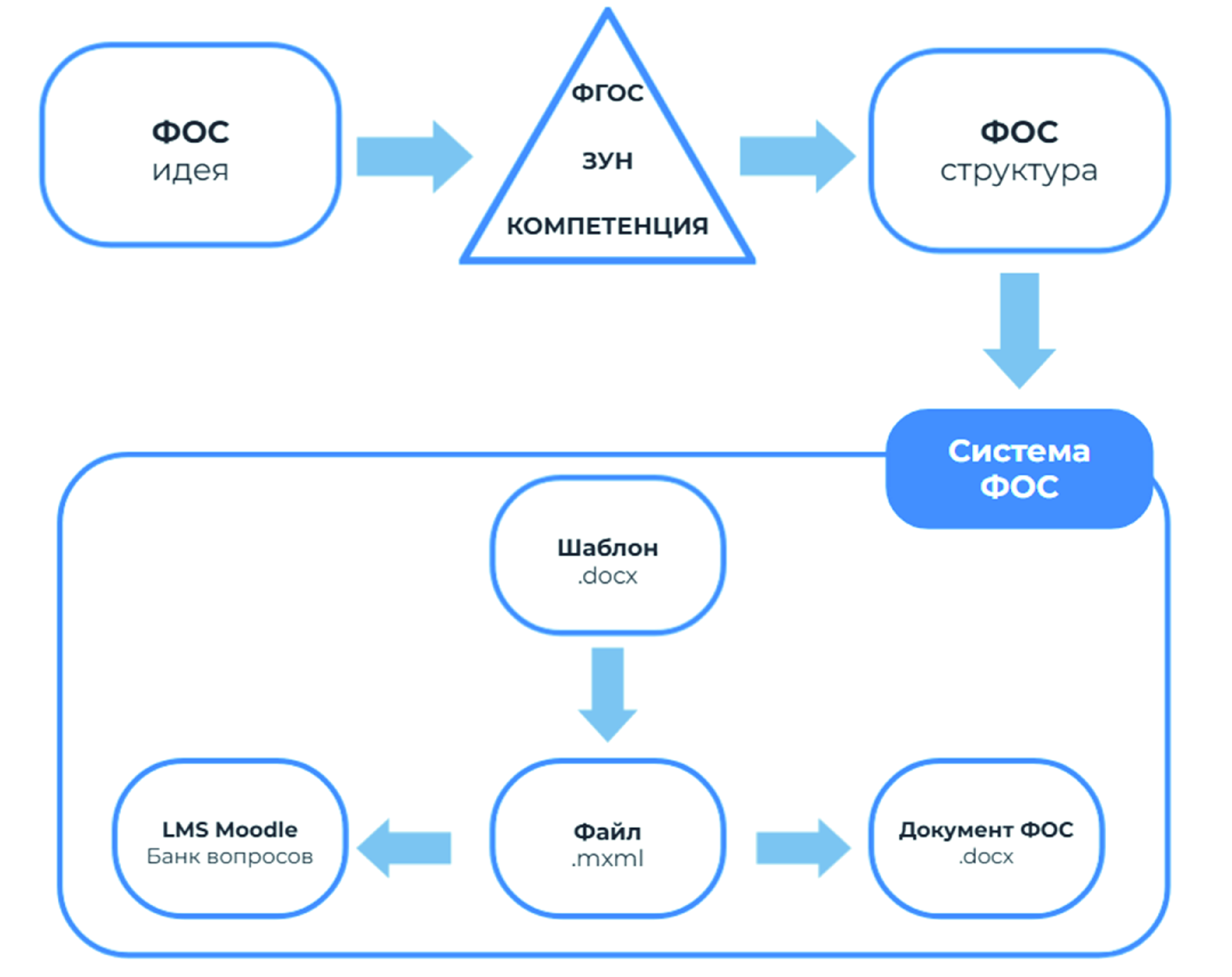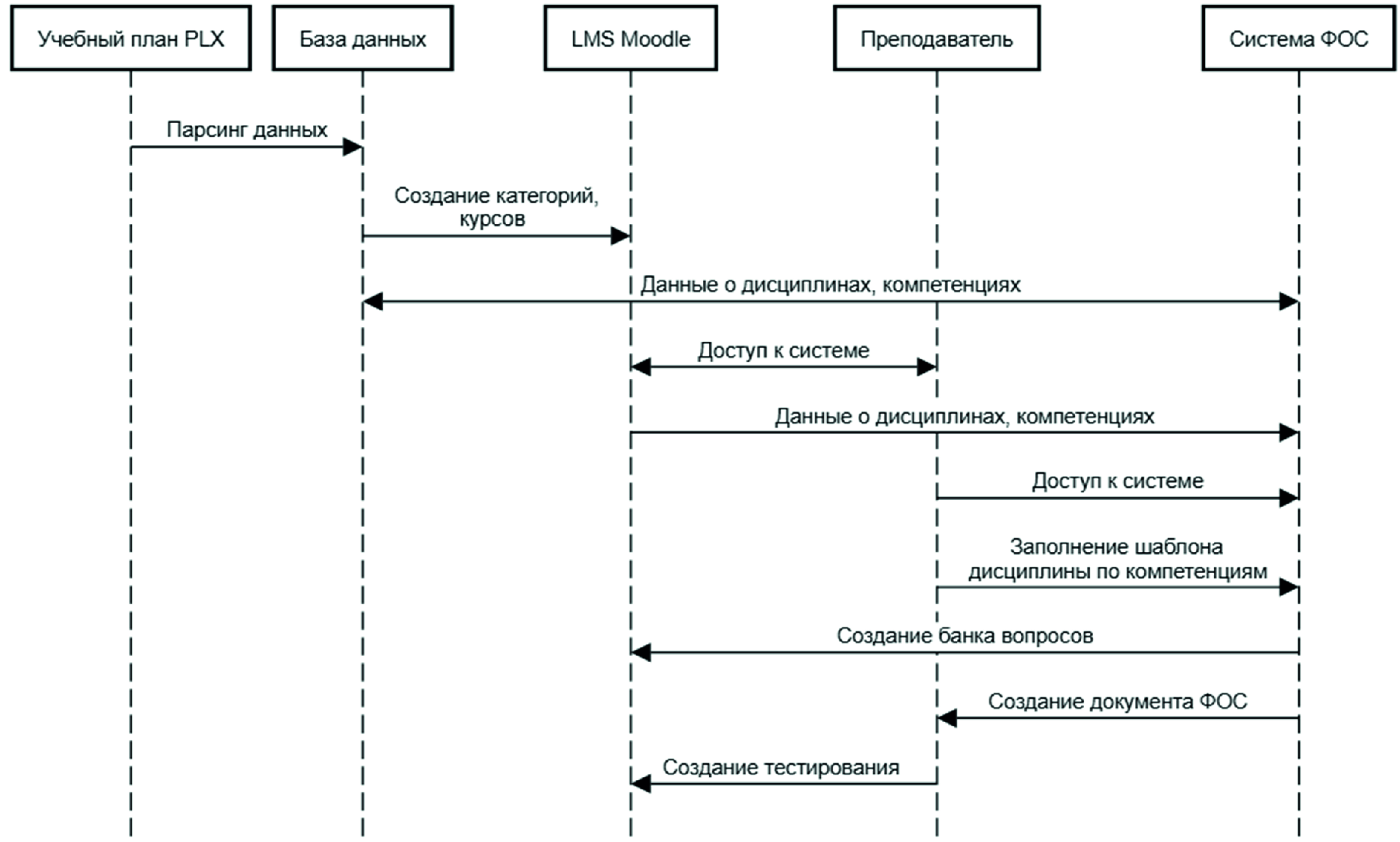 - Обсуждение результатов. Алгоритм работы при формировании ФОС может быть представлен в следующем виде: 1) при помощи веб-интерфейса преподаватель входит в информационную систему; 2) заполнение шаблона с вопросами по дисциплинам, к которым привязаны индикаторы достижения компетенций, установленные образовательной программой; этот шаг позволяет структурировать процесс составления ФОС и последующую оценку освоения компетенций на более системном уровне; 3) загрузка заполненного шаблона в информационную систему и последующее создание банка вопросов в платформе LMS Moodle.
