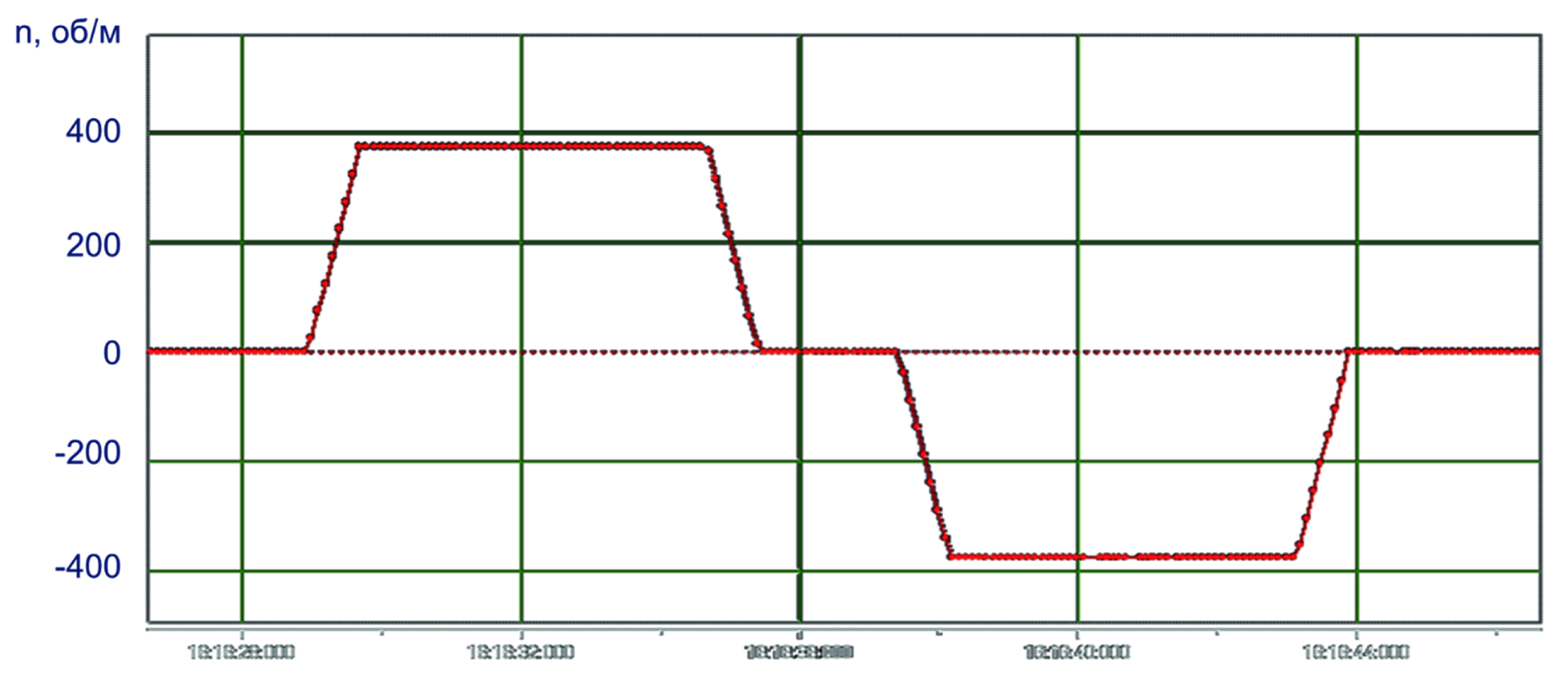 На рис. 6 представлена экспериментальная осциллограмма угловой скорости двигателя механизма В перемещения консольного крана с магнитным захватом. Данная экспериментальная осциллограмма угловой скорости соответствует циклограмме работы механизма В (рис. 1), показанной на рис. 3, что подтверждает сделанный выше вывод.