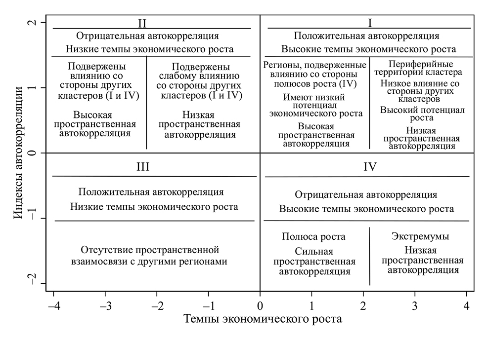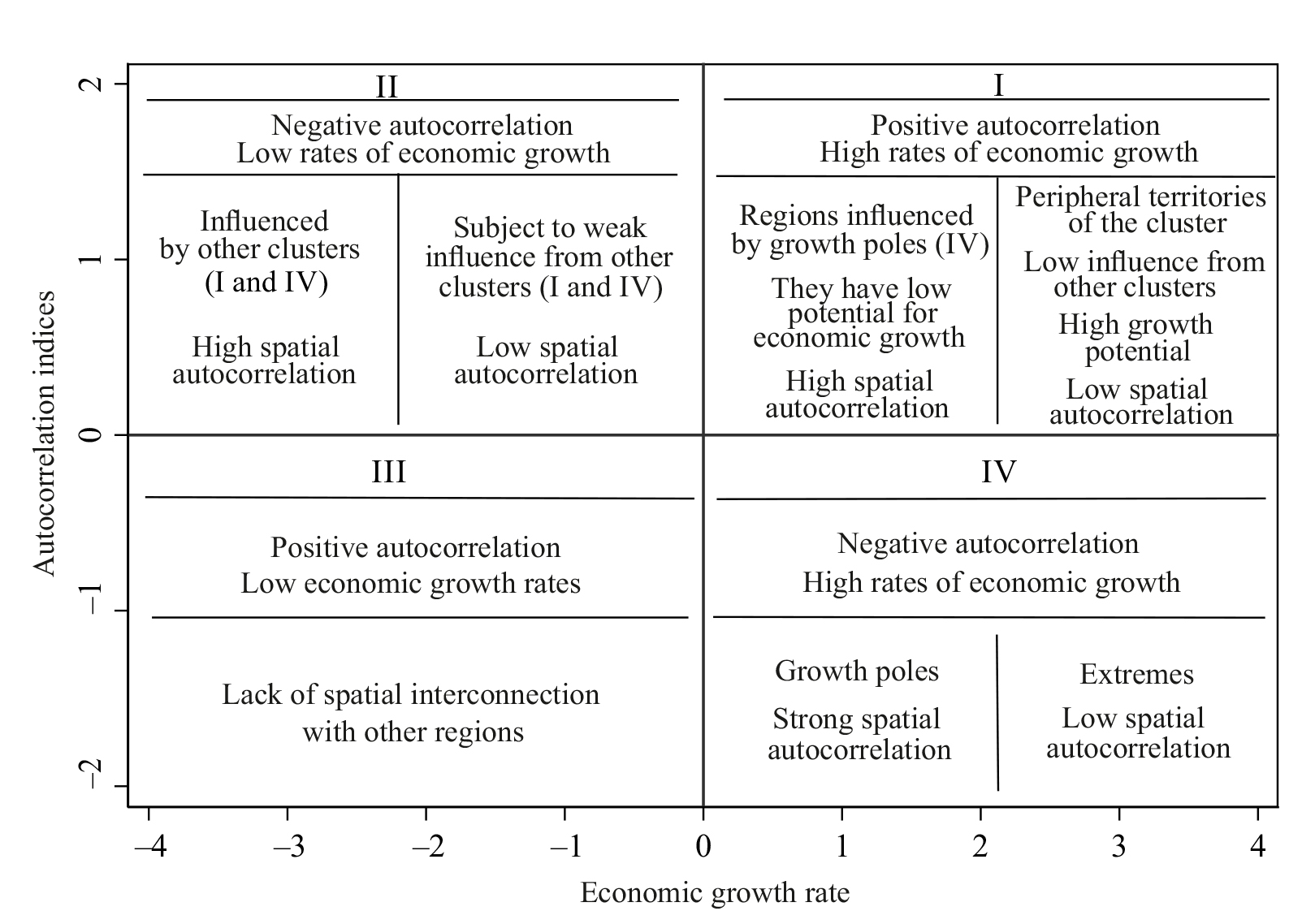 В кластер IV входят территории с отрицательной пространственной автокорреляцией. Регионы с высокими значениями коэффициента являются полюсами роста (ядрами) и формируют кластер территорий с высокими темпами экономического роста, которые оказывают влияние на другие пространственные кластеры (I и II). Регионы с высокими темпами экономического роста и низкой пространственной автокорреляцией относятся к выбросам и не относятся к полюсам роста. Кластер I образуют территории с положительной автокорреляцией. При этом территории с высокими значениями коэффициента пространственной автокорреляции подвержены влиянию со стороны регионов, входящих в кластер IV, однако имеют низкий потенциал к увеличению темпов экономического роста. В свою очередь, регионы, имеющие слабую положительную пространственную автокорреляцию, формируют кластер периферийных территорий, которые также подвержены влиянию со стороны кластера IV, однако степень данного влияния остается низкой.
