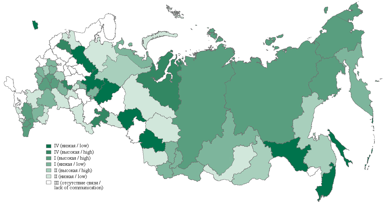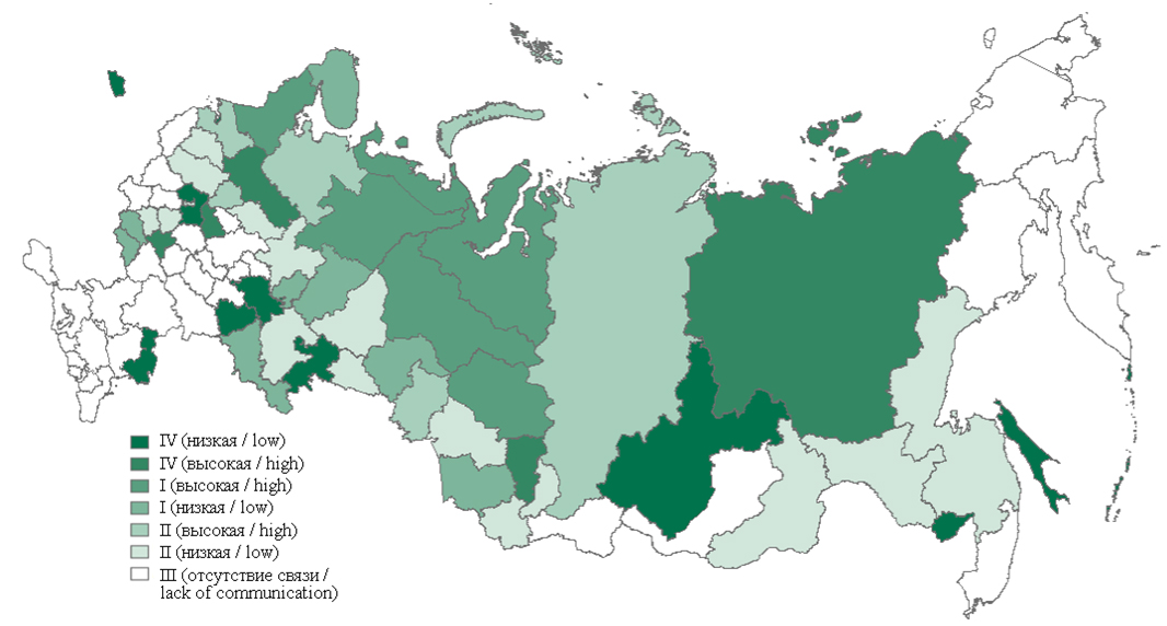Кластер периферийных регионов также в значительной степени изменился в 2016 г. по сравнению с 2014 г. В него вошли Иркутская и Магаданская области, Красноярский край, республики Тыва, Хакасия, Саха (Якутия), Крым и г. Севастополь. Две последние территории, вошедшие в состав России по результатам референдума 2014 г., продемонстрировали высокие темпы экономического роста за счет активной интеграции в национальное пространство, несмотря на то, что имеют относительно низкую пространственную взаимосвязь с остальными регионами.