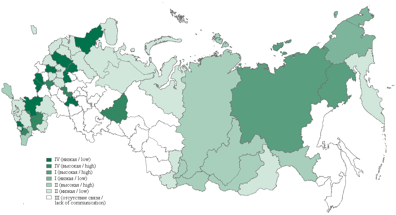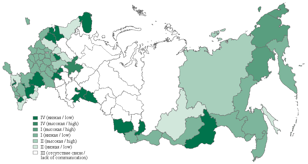 Снижение темпов экономического роста также наблюдается в г. Москве (кластер II), где находится основное количество финансовых и банковских организаций, Калининградской и Ленинградской областях. Пространственное влияние этих субъектов сильно снизилось, и они оказались подвержены влиянию со стороны граничащих регионов.