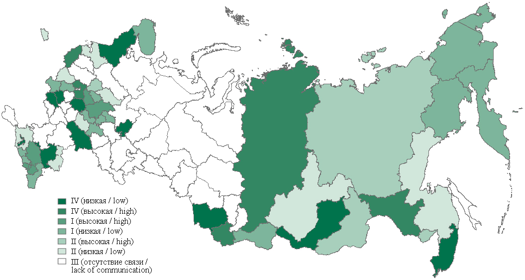 Заметно выделяется группа восточных субъектов России, где высокие темпы роста показал Забайкальский край, однако степень его пространственного влияния низкая. Периферийными регионами с высоким потенциалом экономического роста являются Чукотский автономный округ и Магаданская область, а также Камчатский, Хабаровский и Приморский края, Еврейская автономная и Амурская области, Республика Бурятия, образовавшие кластер территорий с высоким пространственным взаимовлиянием, которое распространяется на территории кластера II, включая Якутию, Сахалинскую и Иркутскую области. Алтайский край, а также республики Тыва, Алтай и Хакассия имели высокие темпы роста, однако их пространственное взаимовлияние низкое.