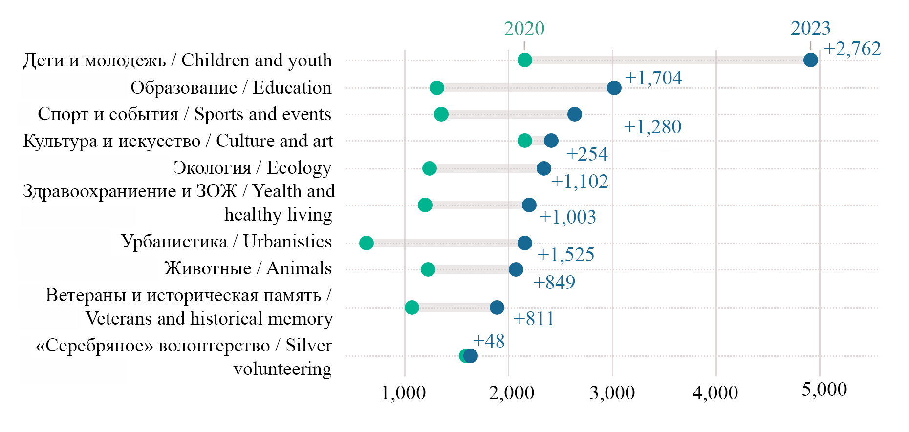 Fig. 2. Number of registered volunteers on the platform “Dobro.ru” in different areas of volunteer work in the Kemerovo Region – Kuzbass