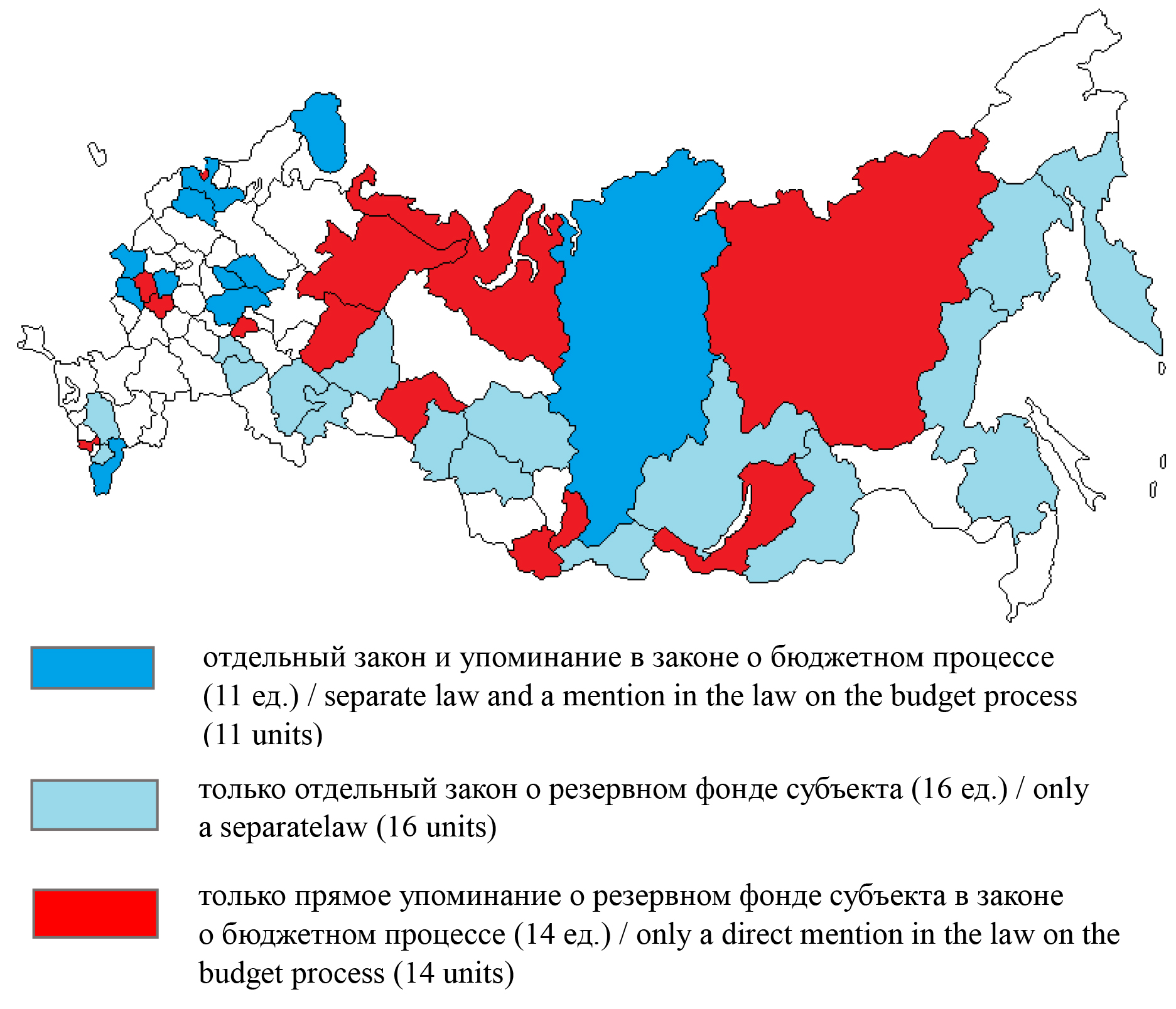 Институциональное оформление. Создание резервного фонда субъекта Российской Федерации предусматривается законом субъекта, за исключением закона о бюджете. Однако на федеральном уровне до сих пор нет официальных агрегированных сведений о наличии и параметрах резервных фондов субъектов Российской Федерации. Таким образом, анализ нормативно-правовых актов на уровне субъектов остается единственным способом собрать сопоставимые сведения о регулировании бюджетного резервирования на региональном уровне в России [28].