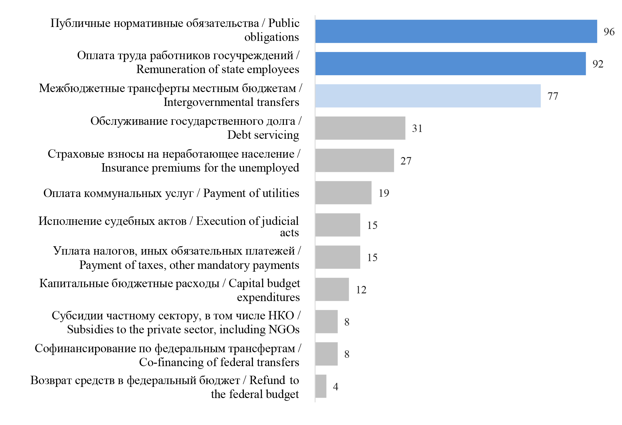 Fig. 3. Priority spending directions of the subject’s reserve fund, % of the number of regions with a reserve fund and disclosure of spending directions (26 regions)