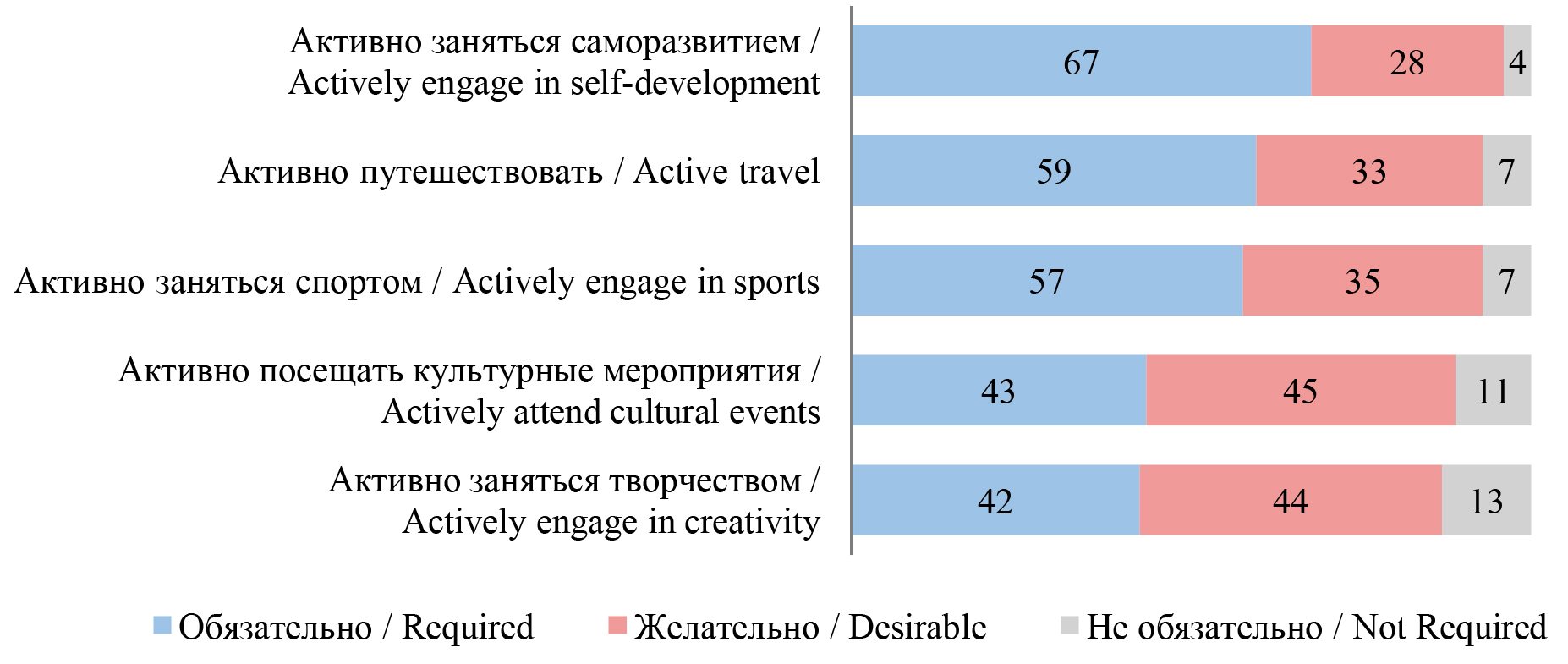 Жизненные выборы молодежи в рамках образовательных стратегий связаны прежде всего с обязательным желанием получить высшее образование и заниматься самообразованием (рис. 9). 31 % опрошенных в качестве обязательных действий указали получение второго высшего образования. Стоит отметить, что жизненные выборы в образовательных стратегиях дают небольшой показатель альтернативной отметки «не обязательно», что показывает их приоритет в жизненном планировании.