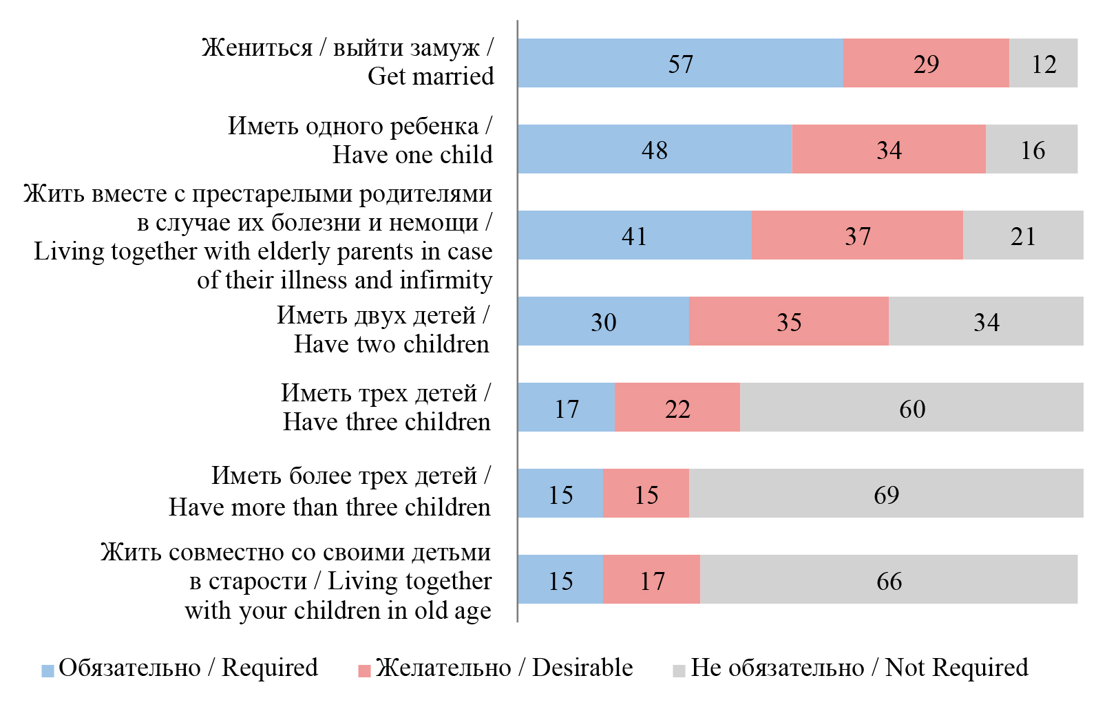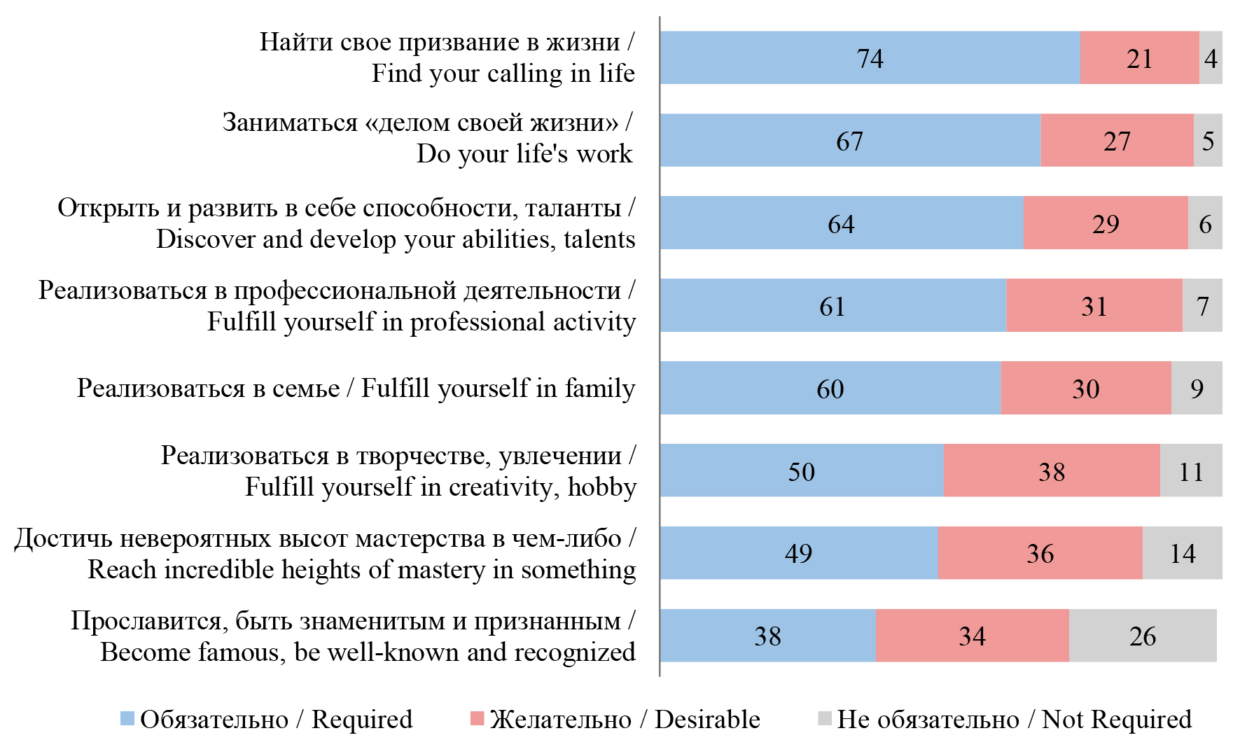 Жизненные планы для каждой стратегии установлены исходя из ключевых жизненных ориентиров молодежи. Вопросы, касающиеся жизненного планирования, были даны в табличной форме с обязательной оценкой каждого выбора по шкале «обязательно», «желательно», «не обязательно». Инструкция к вопросу звучала следующим образом: «Насколько важно для вас в будущем предпринять следующие шаги, где “обязательно” значит, что Вы не будете считать себя состоявшимся в жизни без выполнения этого условия (если Вы уже реализовали какие-то из предложенных вариантов, отметьте их как обязательные)».