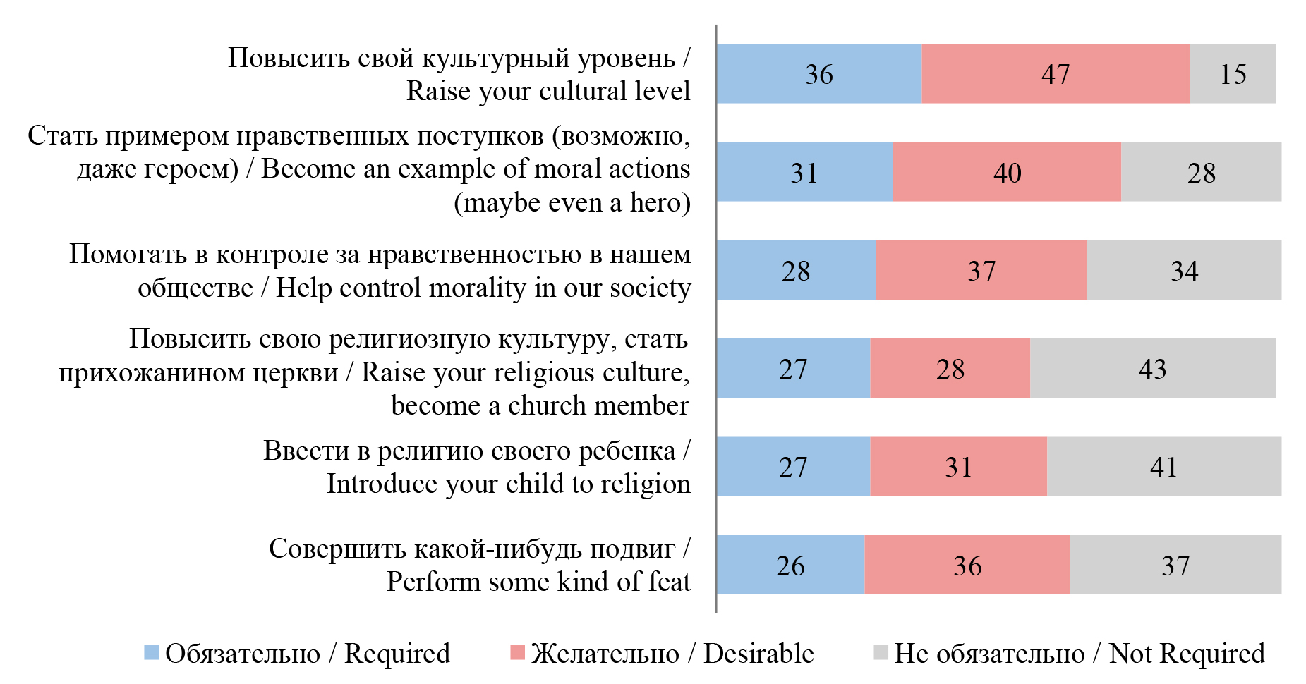 В рамках исследовательской модели духовно-нравственных стратегий была предложена типологизация духовно-нравственных диспозиций и определены основные типы молодежи по этой стратегии: тип ситуативной духовности (большинство выборов – 52 %), тип высокой духовности – второй по популярности ответ среди молодежи (32); конформный тип (11), циничный тип, отрицающий духовность как ценность (4 %). Представленность типа с ситуативной духовностью показывает определенные проблемы молодежного сообщества, связанные с адаптивной моралью.
