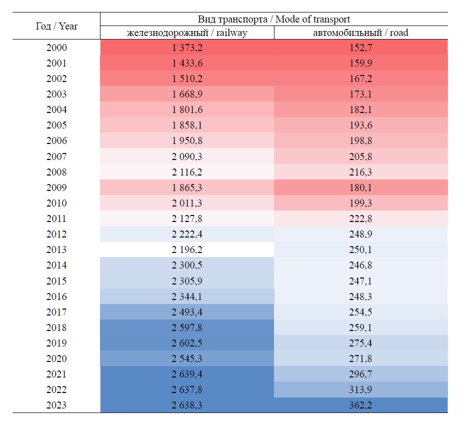 Таблица 1. Динамика развития грузоперевозок железнодорожным и автомобильным транспортом в 2000–2023 гг., млн т13