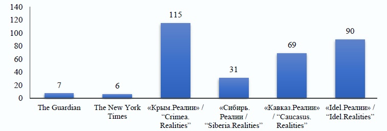 Особую роль в ретрансляции и лоббировании смыслов о «колониальной политике» России в отношении своих регионов играют СМИ, так как масс-медиа не только выполняют информационную функцию, но и могут достаточно быстро и эффективно мобилизовать полиэтническое население России на конкретные действия либо при необходимости провоцировать на бездействие, что особенно актуально после 24 февраля 2022 г. Мониторинг публикаций зарубежных масс-медиа («The Guardian», «The New York Times») и СМИ-иноагентов («Крым.Реалии», «Сибирь.Реалии», «Кавказ.Реалии», «Idel.Реалии») продемонстрировал, что целевой аудиторией контента, направленного на продвижение темы «деколонизации» и возможного распада Российской Федерации, является именно население России, о чем свидетельствует сравнительный анализ количества публикаций зарубежных СМИ и СМИ-иноагентов по исследуемой теме (рисунок).