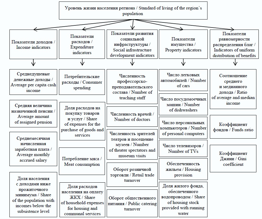 Таким образом, было выделено пять направлений оценки и сформировано пять групп показателей, характеризующих уровень жизни в регионах России (рисунок). Несомненно, на его величину оказывают влияние и иные факторы, в том числе в зарубежных и отечественных источниках достаточно много публикаций, посвященных тому, какое влияние оказал и продолжает оказывать COVID-19 [27; 28]. Однако в рамках данного исследования мы остановились на выделенных группах. Для учета особенностей различных регионов данные показатели были соотнесены с величиной прожиточного минимума (среднедушевые денежные доходы, величина заработной платы и т. д.), численностью населения (численность врачей, число легковых автомобилей и т. д.), количеством домохозяйств в регионе (число посудомоечных машин, число персональных компьютеров и т. д.).