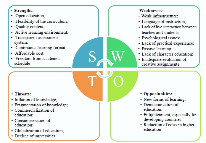 SWOT analysis helps to identify the advantages, disadvantages, opportunities, and threats for the future of higher education. The method helped to identify, on the one hand, the positive and negative aspects of the development of massive open online courses of the MOOCs, on the other, to identify the opportunities and threats of online learning systems for the future development of global and regional levels of higher education (Figure 3).