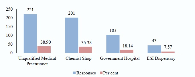 Workers visit government hospitals, ESIC centres and medical stores etc. for treatment (Fig. 1). It was noticed in a study that women workers are unable to get treatment in the public hospitals because the officials do not behave properly and sometimes charge extra money from them [21]. It is true that visits to medical facilities by women may depend somewhat on their living conditions, educational status, financial status and other such variables but at the same time the work conditions also influence the health, health seeking behaviour and utilization of health services.