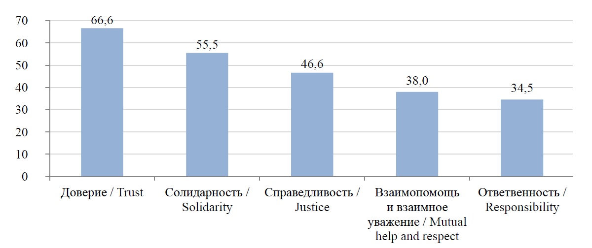 Если социальный капитал, как комплекс ресурсов личности, основанных на ее связях, может быть продуктом интериоризации практически любых ценностей, то социальный капитал городского сообщества определяют лишь ценности коллективистские, просоциальные. К ним следует отнести солидарность, взаимопомощь, доверие, справедливость, ответственность. Социологические исследования показывают, что в настоящее время они, хотя и далеко не все важны для горожан (лидерство сохраняют доверие, солидарность, справедливость), входят в число наиболее значимых для граждан9. Это подтверждают и результаты ответов респондентов в рамках проведенного нами опроса (рис. 1).