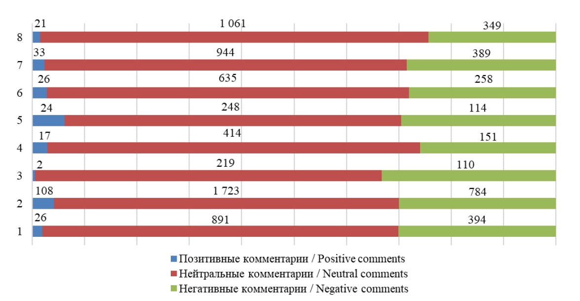 Большинство комментариев нейтральны («Новокузнецк ОНЛАЙН» и «Администрация города Новокузнецка»), лидером концентрации негативных оценок выступают ресурсы «Подслушано Новокузнецк» (302 комментария) и «Администрация города Новокузнецка» (806 комментариев). Рост нейтральных комментариев (высокое присутствие такого рода оценок на фоне остальных) позволяет поддержать идею актуальности данных инноваций, а также коридор, который население (пользователи) готовы использовать для демонстрации себя и «своих» интересов быстро и безболезненно.