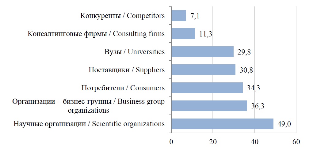 Практика ОИ в корпоративном секторе подтверждает результаты корреляционных расчетов в том, что организации в основном используют собственные силы при взаимодействии с различными акторами. К примеру, организации активно сотрудничают со стартапами (об этом свидетельствуют 92 % опрошенных компаний) и используют такие инструменты, как программы запуска пилотных проектов, бизнес-акселераторы, корпоративные венчурные фонды. Только 8 % компаний используют в работе технопарки и региональные инновационные площадки для проведения испытаний на производственном оборудовании и в реальной инфраструктуре. Абсолютно все респонденты применяют инструменты скаутинга на рынке инновационных технологий и решений. Инструменты поиска в интернет-пространстве (лендинг, социальные сети) уже используют или планируют 46 % компаний, 38 % ‒ проводят или спонсируют мероприятия, целью которых является обмен инновационным опытом. Порталы открытых запросов, где бизнес-заказчики формулируют потребности, а стартапы имеют возможность откликнуться на них, не пользуются спросом в России (данные порталы имеют только 12 % опрошенных компаний). Коллаборации с другими компаниями задействуют только 21 % респондентов. Лишь 25 % корпораций отмечают эффективность поиска инноваций на региональных рынках или среди иностранных источников13.