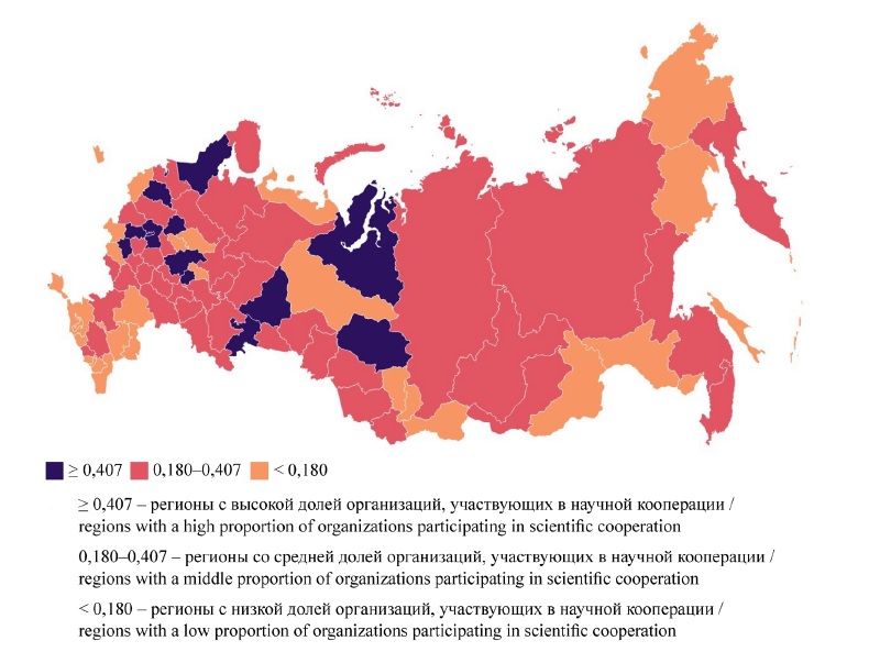 Региональная практика рассматривалась с точки зрения инфраструктурных решений с использованием «Карты кластеров России» НИУ ВШЭ и Национального информационно-аналитического центра по мониторингу инновационной инфраструктуры научно-технической деятельности и региональных инновационных систем (НИАЦ МИИРИС). Для более подробного анализа результативности региональной практики поддержки ОИ использованы показатели рейтинга инновационного развития субъектов Федерации НИУ ВШЭ. Проведена кластеризация субъектов Федерации по признаку доли организаций, участвовавших в научной кооперации за 2015, 2017 и 2020 гг. Используя иерархический анализ (по методу Уорда), субъекты Федерации распределены на три кластера, далее применялся метод k-средних (расчеты производились в программе Wolfram Mathematica). Регионы с высокими показателями научной кооперации анализировались на предмет влияющих факторов с помощью метода расчета корреляции.