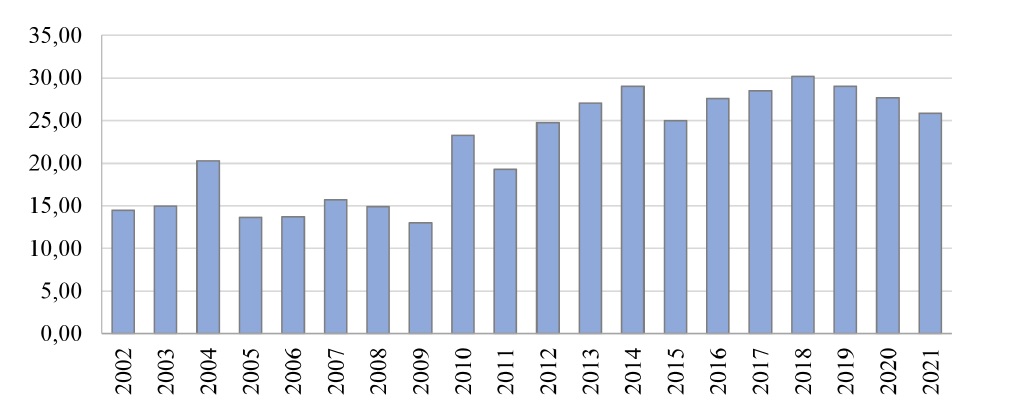 Источником информации стали данные Федеральной службы государственной статистики6. Данные, прослеженные в динамике за 20 лет ‒ с 2002 по 2021 г. (Республика Крым – с 2015 г.), ‒ формировались по 7 регионам ЮФО. Данные о структуре миграционного потока по гендерному признаку формировались с 2017 г. с учетом их представленности Росстатом.