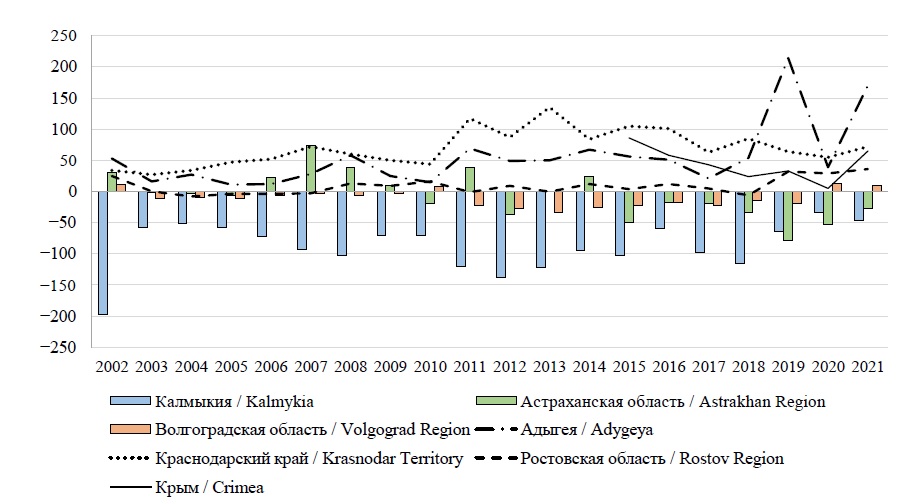 Среди регионов ЮФО можно выделить регионы-доноры, для которых характерен исход мигрантов (Республика Калмыкия, Астраханская и Волгоградская (до 2020 г.) области), и регионы-реципиенты – в которых концентрируются миграционные потоки (Республика Адыгея, Республика Крым, Краснодарский край, Ростовская область).