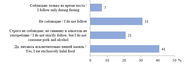 Исключительно пищей халяль питаются 41 % опрошенных, данный показатель стал для нас весьма неожиданным (предполагалось, что он будет существенно меньше), при том что в Мордовии не так много магазинов, продающих халяльную продукцию. Также примерно пятая часть (21 %) респондентов хоть и не питается исключительно пищей халяль, однако придерживается ограничений на употребление свинины и алкоголя (рис. 2).