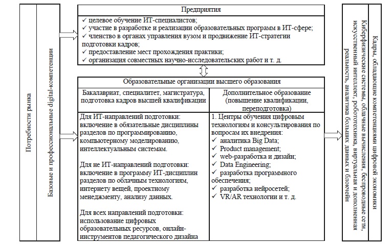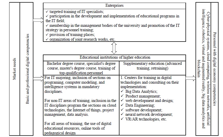В качестве наиболее значимого фактора роста цифровой экономики в России и за рубежом ученые, с одной стороны, определяют участие работодателей в подготовке ИТ-кадров высшей школой, а с другой – обосновывают концепцию корпоративного университета в составе корпоративной структуры компаний, чья основная деятельность не относится к сфере образования, для формирования актуальных цифровых компетенций у сотрудников в форме дополнительного профессионального образования [7]. Вызовы, стоящие перед предприятиями по цифровизации их деятельности, могут решаться и на этапе подготовки кадров высшей квалификации [22].