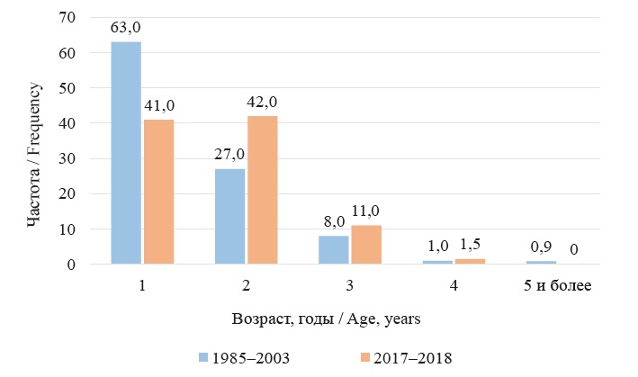 Распределения женщин-рожениц по возрасту в двух городах России представлены в таблице 2, из которой видно, что между ними нет статистически достоверных различий: 55 % женщин в выборках из Тюмени и Петропавловска-Камчатского рожают детей в возрасте от 26 до 33 лет. В предыдущий временной период, на рубеже ХХ и ХХI вв. (1985–2003 гг.), самую многочисленную группу представляют женщины в возрасте 18‒25 лет (62 %). Доля женщин, которые становятся матерями в 26–33-летнем возрасте в два раза меньше, чем в 2017–2018 гг., меньше и женщин старшего возраста ‒ 38–44 лет (рис. 3). Средний возраст рожениц в двух городах в исследуемый период времени одинаков: 30,1 ± 0,63 – в Тюмени, 29,5 ± 0,38 – в Петропавловске-Камчатском.