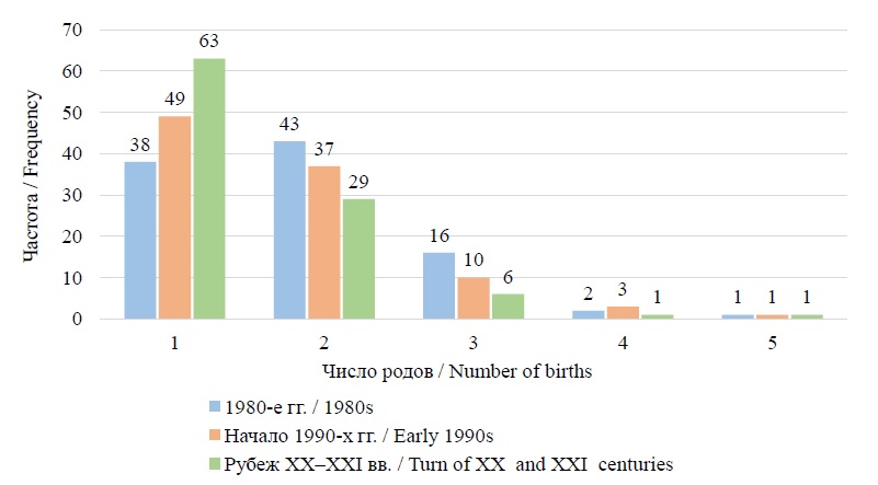 Fig. 5. Distribution of women (n = 4 247) by the number of births in different periods of time in the Tyumen Region, %