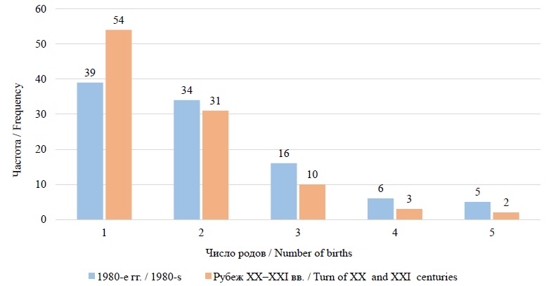 Выполнен анализ архивных документов медицинских учреждений в г. Петропавловске-Камчатском и г. Тюмени за 2017–2018 гг. Для исследования были отобраны данные о беременных женщинах, 85 % из которых имеют одинаковую национальную принадлежность (среди них большая часть представлена русскими, также в эту группу были отнесены украинки и белоруски). В этой же выборке проанализировали распределение рожениц по числу родов.