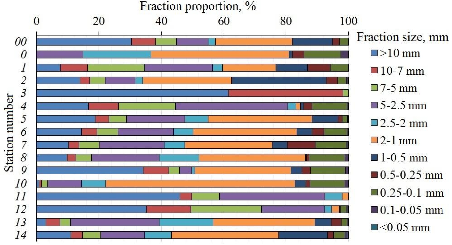 The third area (stations 11–14) is characterized by a gradual decrease in the width of the beaches from 43 to 5 m. As a result, the amount of sand material decreases, and the amount of gravel one increases. A slight increase in the proportion of silty material is explained by its moving from the cliffs composed of clay-sand sediments in the rear section of the beach.
