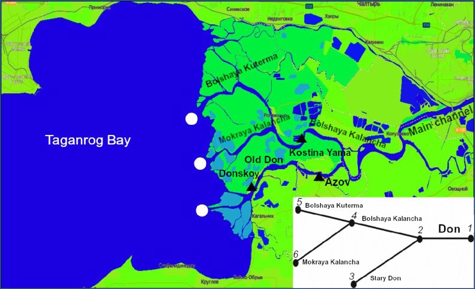 The area of calculation is the mouth section of the Lower Don from the stanitsa of Razdorskaya to Taganrog Bay, including its eastern part. This section consists of the main channel of the Don and its main branches, the Old Don, the Bolshaya Kalancha turning into the Mokraya Kalancha and the Bolshaya Kuterma (Fig. 1). White circles indicate points in Taganrog Bay where calculated water level values were taken, black triangles indicate the hydrological stations where observations were made.