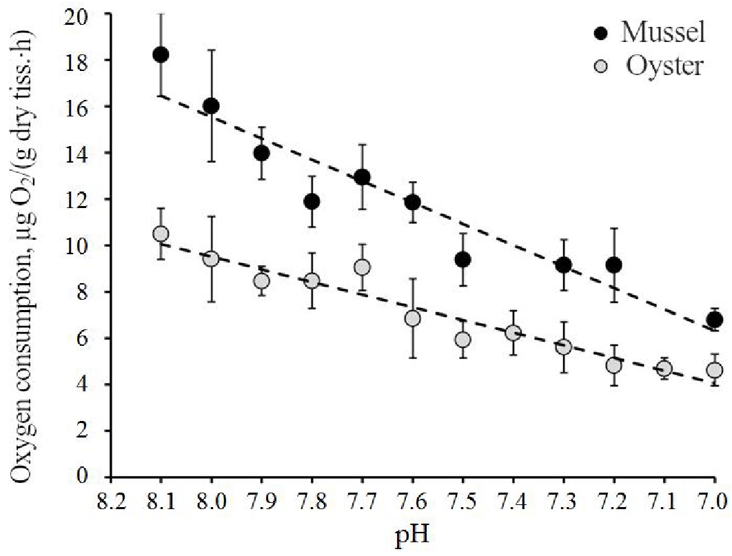 The study found that mussels normally had higher energy metabolism levels (18.23 ± 1.2 µg O2/(g dry tiss.·h) than oysters (10.50 ± 1.1 µg O2/(g dry tiss.·h)).A decrease in seawater pH led to a decrease in respiration in both mollusk species (Fig. 1). A linear negative dependence of oxygen consumption on pH values was found for mussels M. galloprovincialis (R² = 0.90) and oysters M. gigas (R² = 0.93).