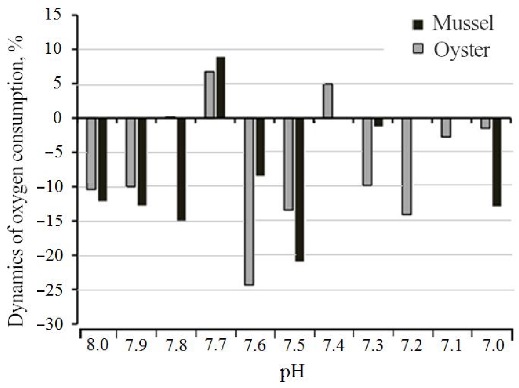 Thus, acidification of seawater led to a decrease in the respiration intensity in mussels M. galloprovincialis and oysters M. gigas. At pH 7.5–7.7, the most noticeable changes in the level of energy metabolism occurred in the studied molluscs (Fig. 2). After a uniform decrease in oxygen consumption in both species at pH 7.7, an unexpected increase in this indicator was recorded (by 8.9% in mussels and by 6.7% in oysters) followed by a sharp drop by 20–30% from the previous values (at pH 7.5–7.6). At the same time, the two species showed different physiological response: the mussels steadily maintained the level of aerobic metabolism when pH decreased from 7.4 to 7.1 (no changes in respi-ration rate), while the oysters demonstrated a uniform decrease of aerobic processes to minimum values.