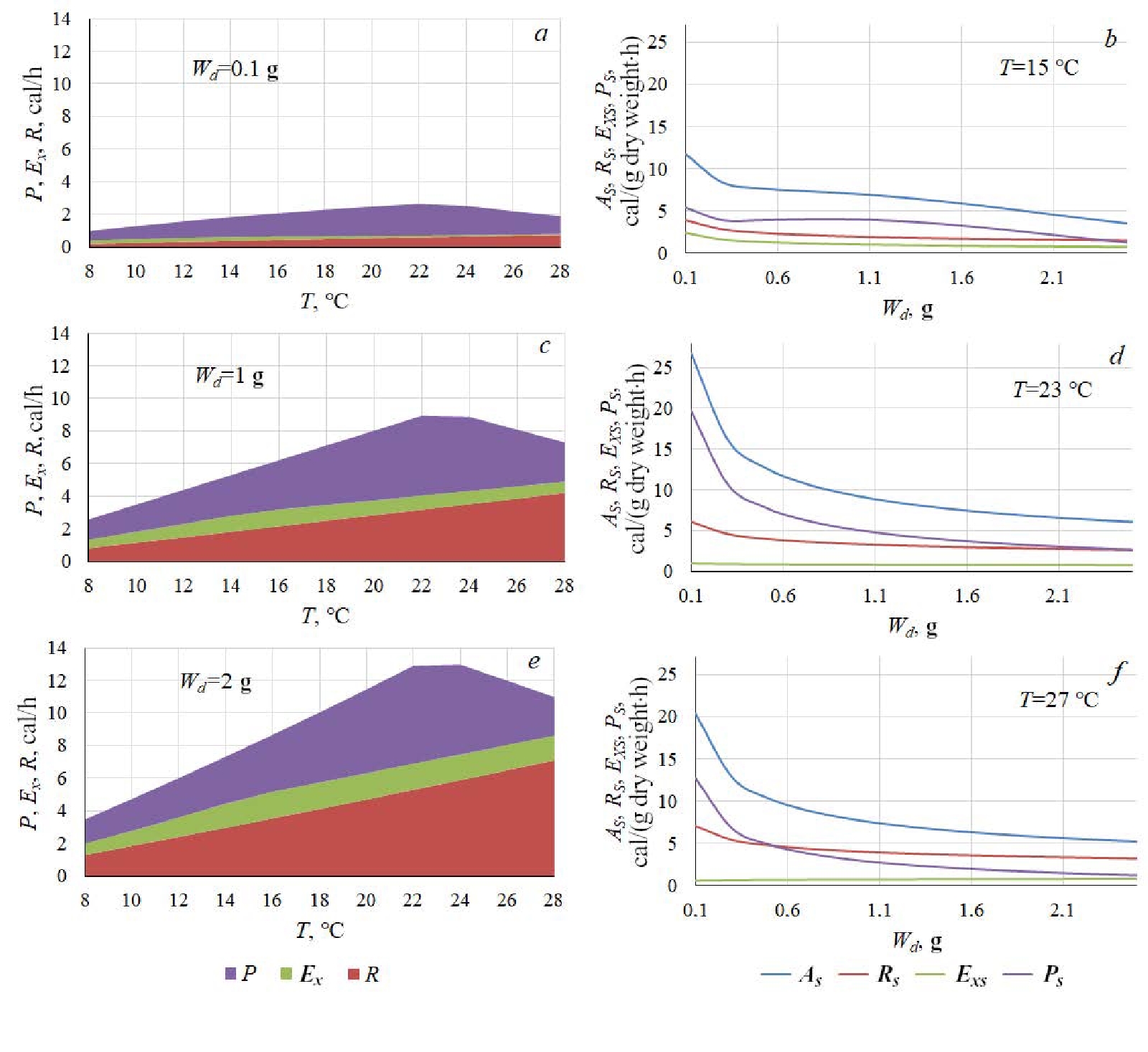 Fig. 2, b, d, f shows specific (normalized for dry weight) components of the energy balance depending on the dry weight of soft tissues of the oyster for different temperatures. Some special features of the energy balance variations of oysters should be noted. At temperatures of 22–24 °C, assimilation and production take on maximum values. The growth energy costs are determined by the difference between assimilation and metabolic costs (respiration and excretion). In small-sized mollusks, productive energy exceed excretion and respiration, and less energy is spent on growth with increasing body weight. With the growth of a mollusk, the specific values of assimilated energy, growth energy and respiration decrease, while the excreted energy remains the same. In too warm water (27 °C), the respiration costs of oysters exceed the productive energy.