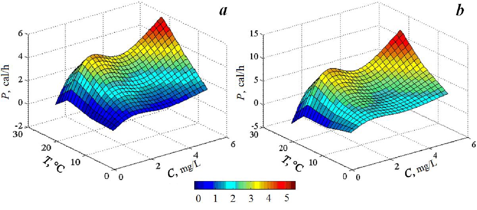 Fig. 3 shows the dynamics of changes in productive energy due to the combined action of two variables (feed suspension concentration and temperature) for oysters of two sizes: Wsoft = 4.5 g, H = 26 mm and Wsoft = 27 g, Н = 59 mm. For oysters of both sizes, it is possible to identify areas of lack of growth due to nutrient deficiency at low feed suspension concentrations in sufficiently warm water. The growth of oysters begins at a feed suspension concentration above 1 mg/L and a temperature greater than 8 °C. Maximum growth rates are observed at a maximum feed suspension concentration and a temperature of 23 °C.