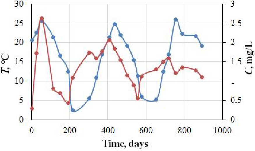 Fig. 4. Environmental parameters of the central Donuzlav Bay which affect the oyster cultivation. The red curve is water temperature; the blue curve is feed suspension concentration