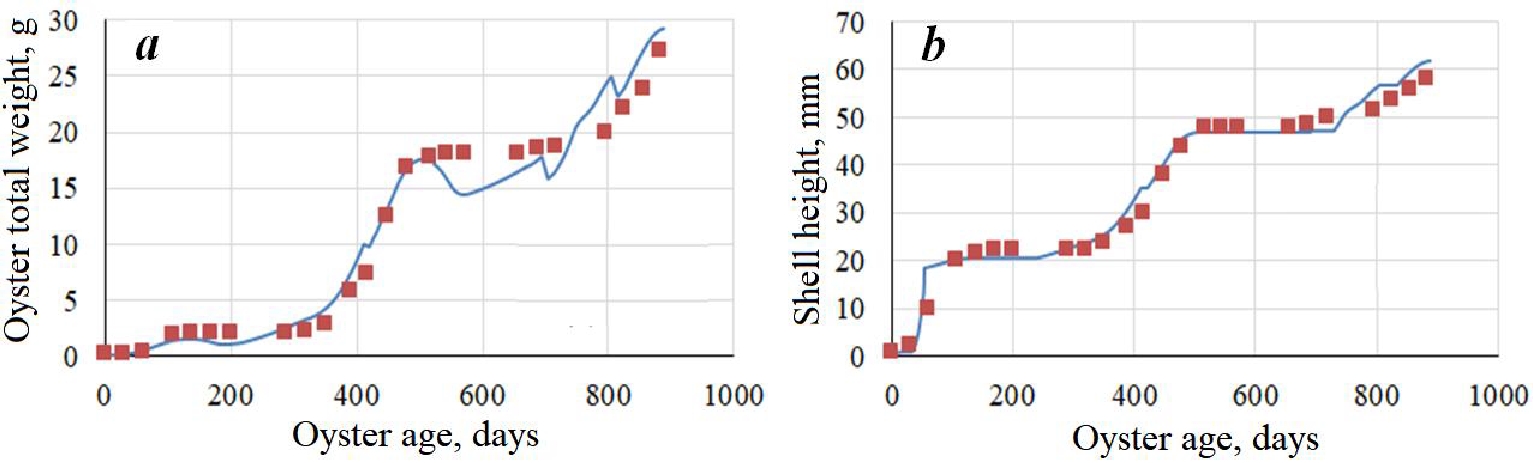 Model validation. The study 1) presents in situ data on the linear and weight growth of oysters O. edulis cultured in Donuzlav Bay for 30 months from April 2001 to October 2003. The intervals between successive measurements of the average weight and height of oysters vary from 1 to 2 months. The model was validated by comparing the simulation results with these data. The model integration step was one day. The time of the model experiment was 30 months. The experiment began on 19 April 2001 and ended on 29 October 2003. The series of control variables for the model (water temperature and suspension concentration) were also taken from work 1) (Fig. 4). They corresponded to the average characteristics of the central Donuzlav Bay during the study of the mollusks growth .