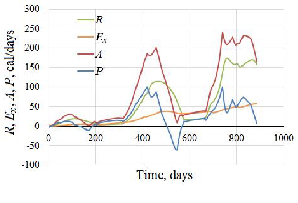 The simulation results allow detailed studying the dynamics of the energy balance components of cultivated oysters. Fig. 6 shows how much energy the oyster assimilates daily and how this energy is distributed among the processes of growth, respiration and excretion during 30 months of cultivation. Assimilated energy maxima correspond to feed suspension concentration maxima, which are usually followed by spawning periods. Productive energy is positive for a long time, and a mollusk grows. However, as a result of spawning, mass of a mollusk decreases, the assimilated energy is not enough to cover the costs of respiration and excretion, and growth is inhibited.