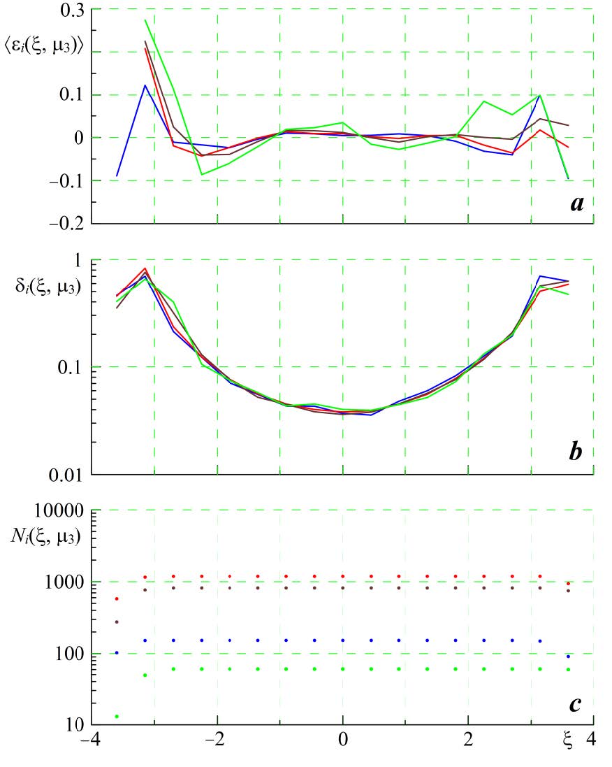 Fig. 2. Variables ε(ξ) (a), δ(ξ) (b), N(ξ) (c) calculated for four ranges μ3: –0.2 < μ3 £ 0 (blue), 0 < μ3 £ 0.1 (red), 0.1 < μ3 £ 0.2 (brown), 0.2 < μ3 £ 0.3 (green)