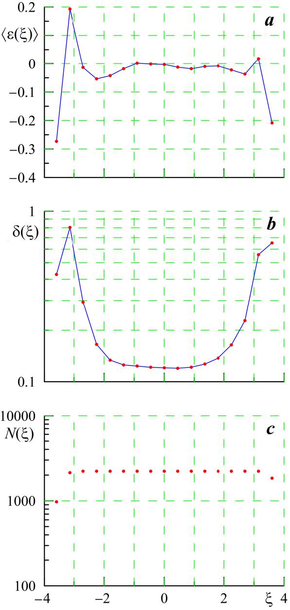 Fig. 1. Relative error ε(ξ) (a) and standard deviation δ(ξ) (b) calculated for an ensemble of situations, the number of points N(ξ) from which statistical characteristics were calculated in a given interval Dξ (c)