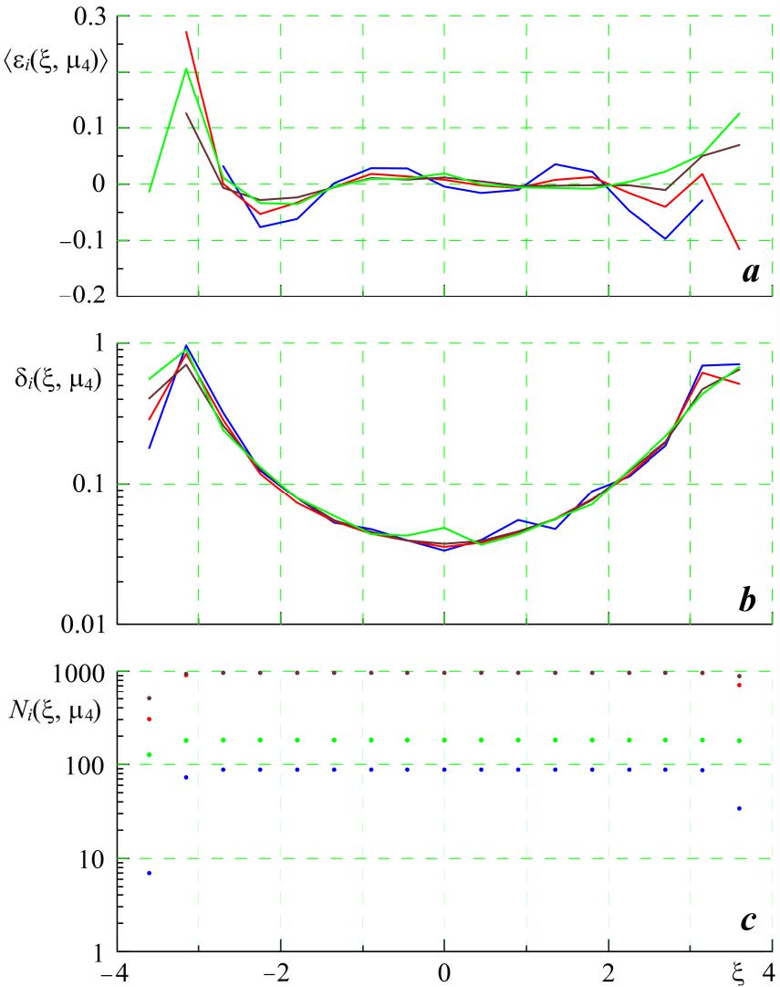 Рис. 3. Значения ε(ξ) (a), δ(ξ) (b), N(ξ) (c), рассчитанные для четырех диапазонов μ4: 2.6 < μ4 £ 2.8 (синий цвет), 2.8 < μ4 £ 3.0 (красный цвет), 3.0 < μ4 £ 3.2 (коричневый цвет), 3.2 < μ4 £ 3.4 (зеленый цвет)