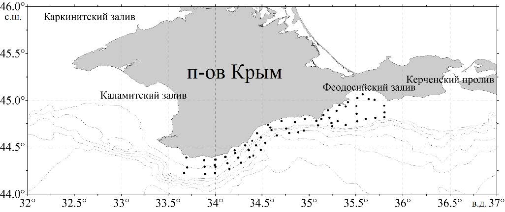 Fig. 1 shows the area under study and sampling map. The studied area includes a 12-mile zone of the Crimean coast in the northern part of the Black Sea.