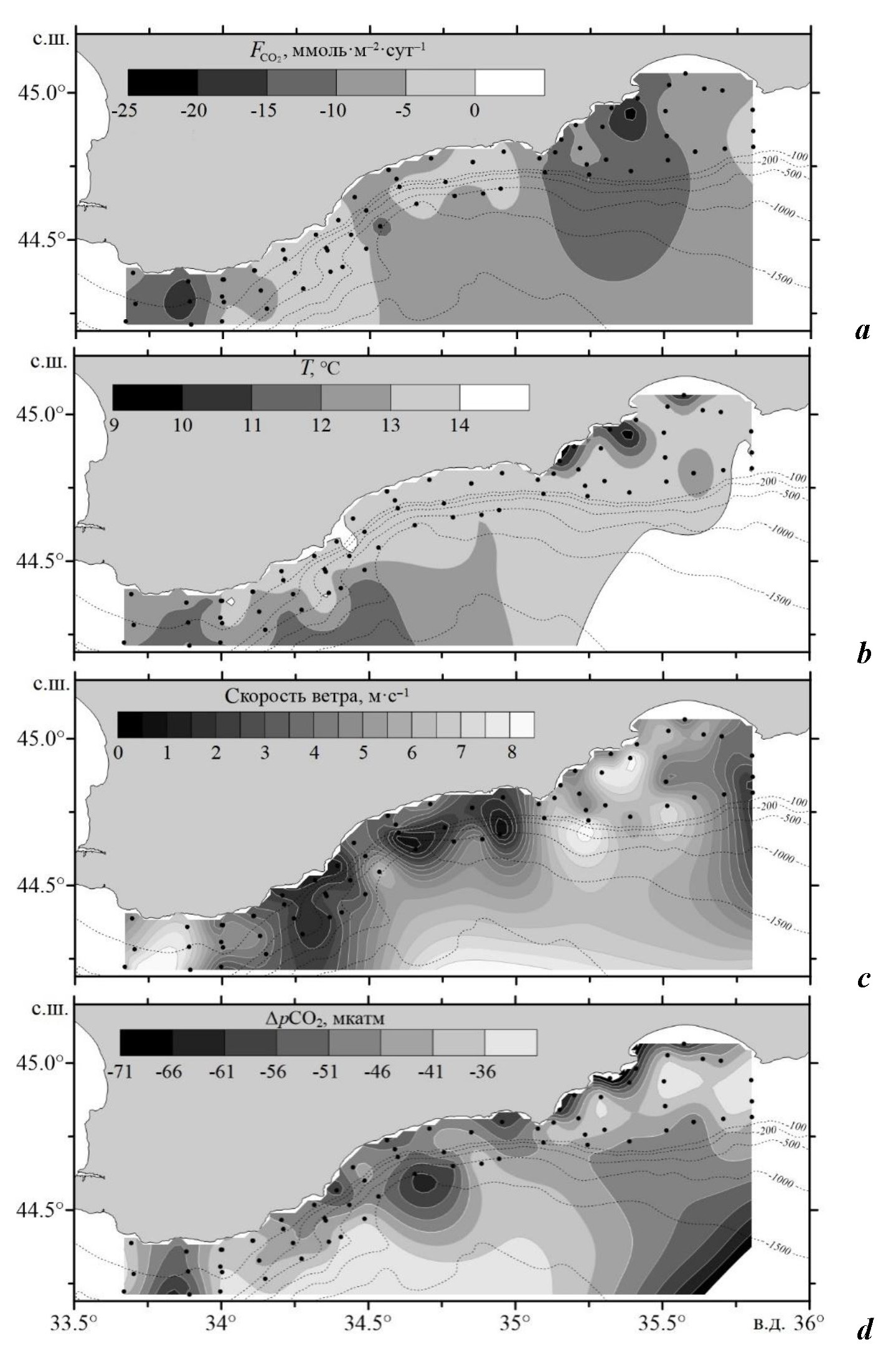 In terms of quality, the CO2 flux spatial variability coincides with the distribution of temperature, wind speed and ΔрСО2 in the sea surface (Fig. 2). Minima of temperature and ΔрСО2 of the sea surface, as well as maximum wind speed were observed in zones of maximum intensity and minimum flux (Fig. 2).
