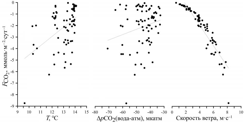 It is known that the CO2 flux value depends on wind speed and ΔрСО2 to the greatest extent [18, 19].