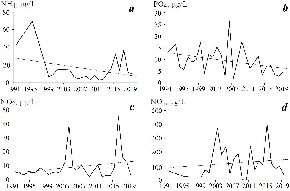 The absence of significant trends in nutrient concentration changes in 1991–2020 confirms the conclusions made in [5, 15]. During the same period, no significant trends in other abiotic components of the ecosystem, such as river runoff, precipitation and water level, were observed [1]. During this period, multidirectional trends in the nutrient concentrations were identified in wastewaters [4]. Obviously, the integral influence of all these factors (economic activity and warming) and sources of nutrient entry (river runoff and wastewaters) during the period under review did not significantly affect the nutrient temporal variability.