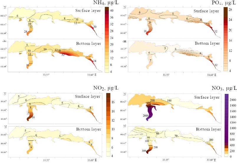 The content of all nutrients in the bottom layer of water is lower than in the surface one, excluding the concentration of ammonium nitrogen, especially in the area of station 8 (see Fig. 2). Ammonification increases under anaerobic conditions in the deep-sea part of the bay. Therefore, an increased concentration of ammonium nitrogen is observed in the bottom layer of water.