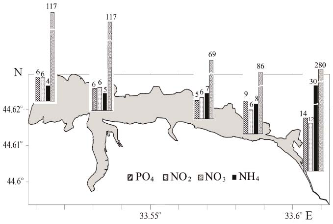 The highest concentration of all nutrients was observed in the water of Yuzhnaya Bay exposed to the impact of storm water runoff, emergency sewage discharges, under-channel runoff, etc. Pollution of this part of the estuarine zone by nutrients is facilitated by difficult water exchange with Sevastopol Bay due to its geomorphological features (see Fig. 2). The decontaminating effect of sea water with a lower nutrient concentration extends to the western part of the estuarine zone, but at the same time denser sea water and prevailing wind direction (along the axis of the estuarine zone) complicate water exchange between Yuzhnaya and Sevastopol Bays. This promotes the accumulation of pollutants at the top of the stagnant Yuzhnaya Bay.