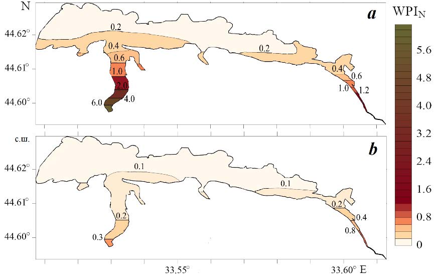 Assessment of water quality and self-purification. The assessment of the water quality of the Chernaya River estuarine zone in terms of nutrient content was carried out according to formula (1) using average (Fig. 8, a) and median (Fig. 8, b) concentration values. Fig. 8 shows that WPIN calculated from arithmetic mean concentrations is 2–6 times greater than WPIN calculated from median concentrations. The highest value of WPIN calculated from median concentrations (Fig. 8, b) is observed in the surface layer of water of the Inkerman Lagoon, since the main source of nutrients is the Chernaya River runoff.