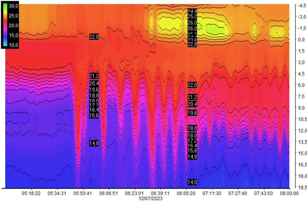 The created system of three thermoprofilemeters was tested for more than a year (from June 2021 to August 2022), which made it possible to analyze the data for two indicated seasonal periods. Almost all recorded significant changes in the depth of the pronounced thermocline were accompanied by wave processes reflected in vertical temperature profiles. Visualization (with a pronounced periodicity of at least five consecutive frequency components) and possibility of interpretation made it possible to determine about 10 manifestations of short-period internal waves lasting from 1 to 4 hours in one season. Such waves showed their average period of 10–12 minutes and amplitude of 2.5–3 m. Fig. 3 shows the examples of data display on the monitor screen during processing by the program in telemetric measurement mode.